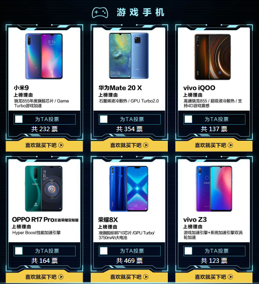 而游戲手機(jī)候選產(chǎn)品則包括:小米9、華為Mate20 X、vivo iQOO、OPPO R17 Pro王者榮耀定制版、榮耀8X、vivo Z3六強(qiáng)爭(zhēng)霸,同樣截至3月12日,第一天的投票中,榮耀8X脫穎而出,暫時(shí)領(lǐng)先。