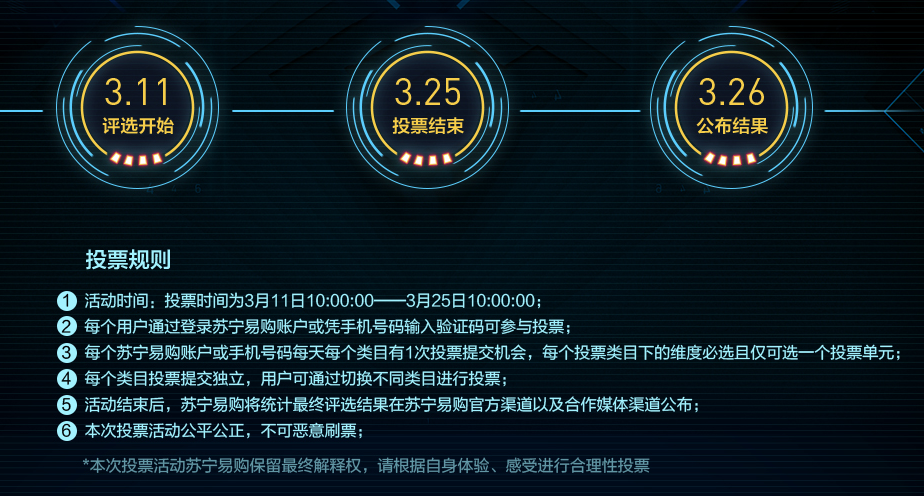 3月11日用戶投票評(píng)選開始,3月25日投票結(jié)束,26日正式公布投票結(jié)果,活動(dòng)貫穿蘇寧易購(gòu)315全民煥新節(jié)期間,面對(duì)眾多手機(jī)、電腦、數(shù)碼新品,用戶會(huì)作何選擇?