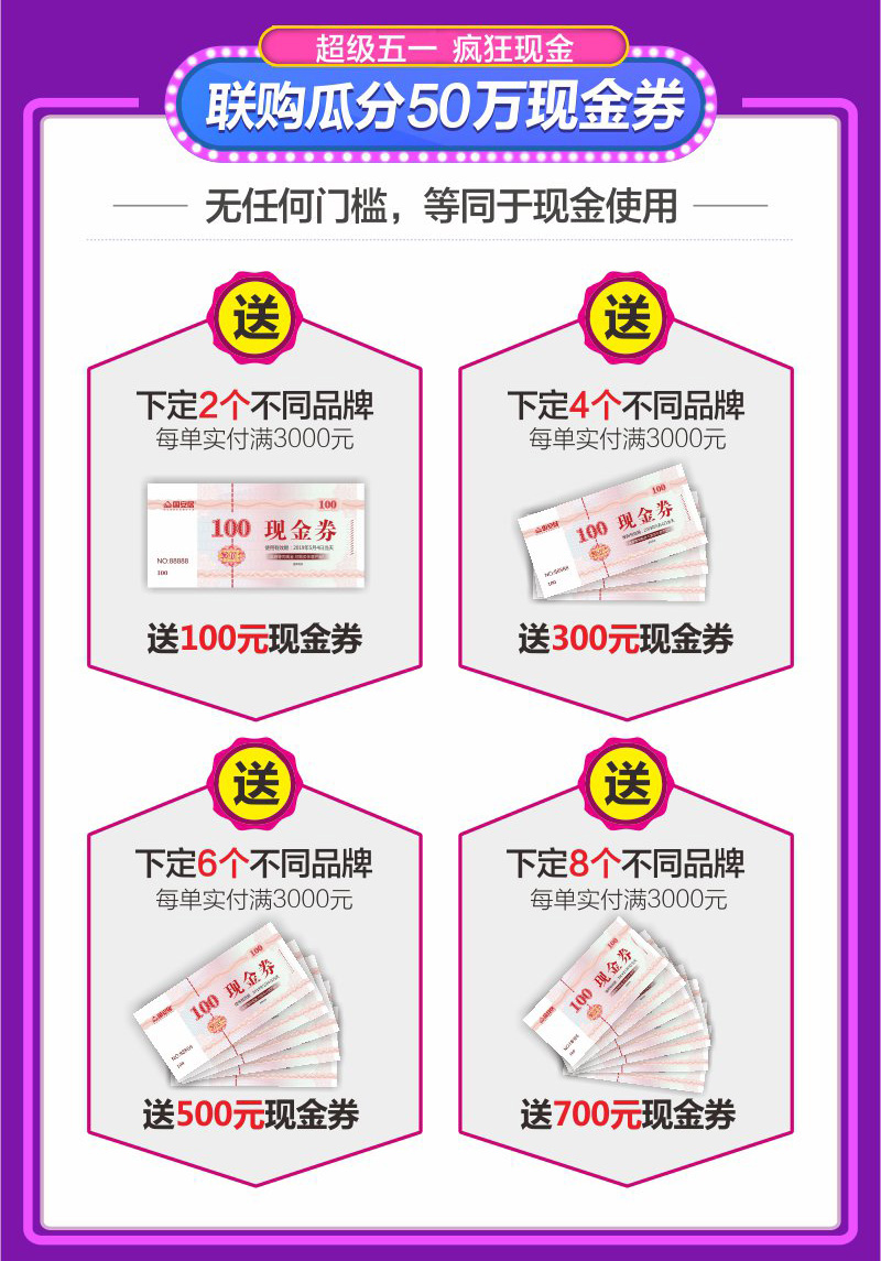 3、聯(lián)購(gòu)滿額瓜分50萬現(xiàn)金券:5月1日-5月4日活動(dòng)期間,顧客每單實(shí)付3000元,下定2個(gè)不同品牌,即送100元現(xiàn)金券,下定4個(gè)不同品牌,即送300元現(xiàn)金券,下定6個(gè)不同品牌,即送500元現(xiàn)金券,國(guó)安居準(zhǔn)備了50W現(xiàn)金券,送完即止。