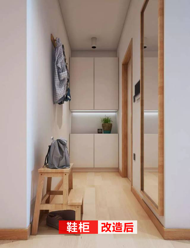 改造后的簡潔清爽,和原來根本就是天差地別,干凈的白色到頂柜子,可以收納很多鞋子及其他物品,連換鞋凳和出門鏡都一一具備。