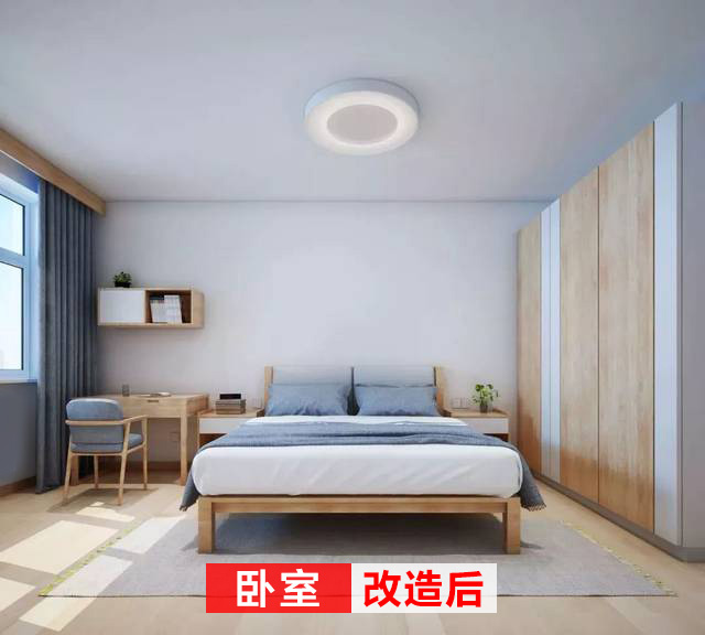 改造后的臥室開闊簡潔,藍(lán)灰色床品與窗簾,色調(diào)一致,一整排的衣柜完全可以滿足生活需求。