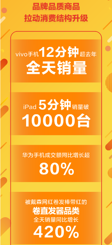 作為傳統(tǒng)優(yōu)勢(shì)品類,手機(jī)在今年618年中購(gòu)物節(jié)首日的表現(xiàn)仍舊搶眼。vivo手機(jī)12分鐘超去年全天銷量,最終全天的銷量達(dá)到去年同期的11倍;華為手機(jī)成交額同比增長(zhǎng)超80%,華為手機(jī)配件成交額同比增長(zhǎng)超300%; iPad在5分鐘的銷量就突破萬(wàn)臺(tái)。