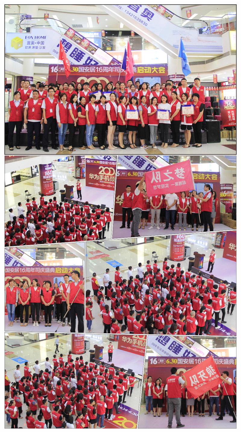 6月13日-14日,國安居“16周年司慶”啟動大會在國安居深惠門店火熱舉行,800家品牌商家的銷售精英、員工代表、熱心市民等近萬余人共同見證了這一意義非凡的時刻。參與者身著統(tǒng)一服裝,早早就聚集在商場中庭,所有人都把笑容掛在臉上,展現(xiàn)出自己最陽光、最開心、最具活力的一面。