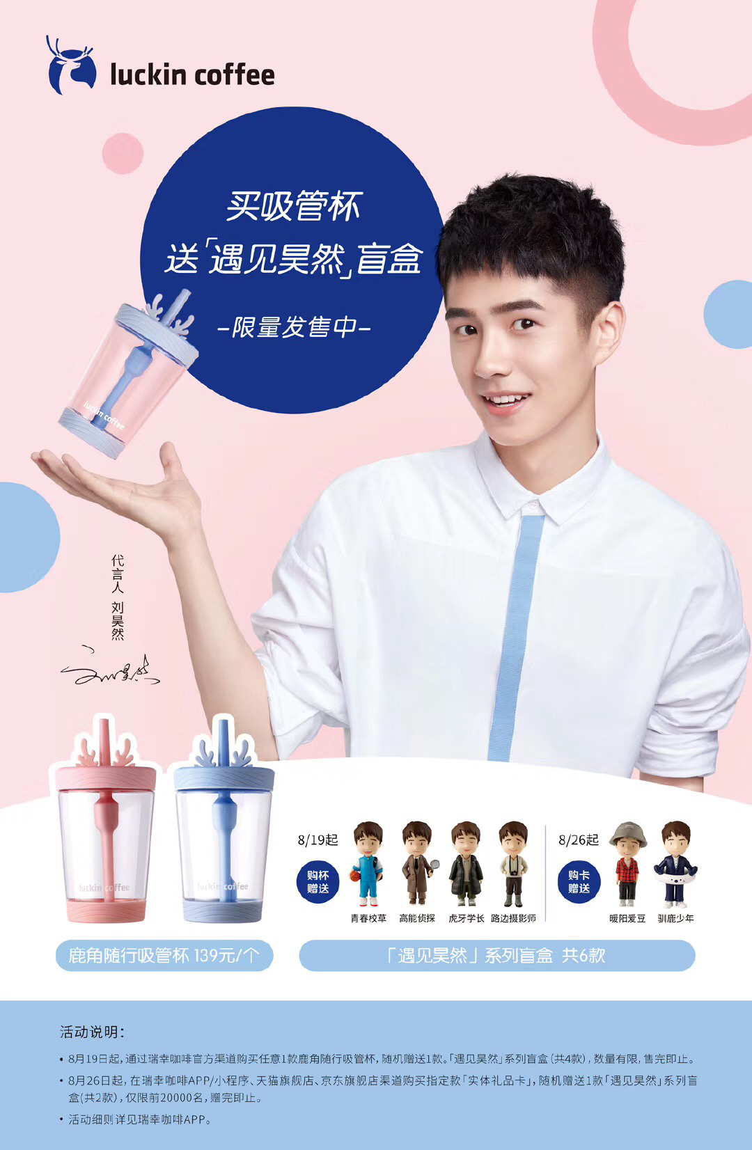 據(jù)了解,該系列盲盒共分為六款。其中,8月19至9月18日期間上線四款,用戶購買任意一款鹿角吸管杯,將隨機(jī)獲贈(zèng)遇見昊然系列盲盒一個(gè);剩余兩款則將在8月26日瑞幸咖啡上線實(shí)體禮品卡時(shí)同步上線。
