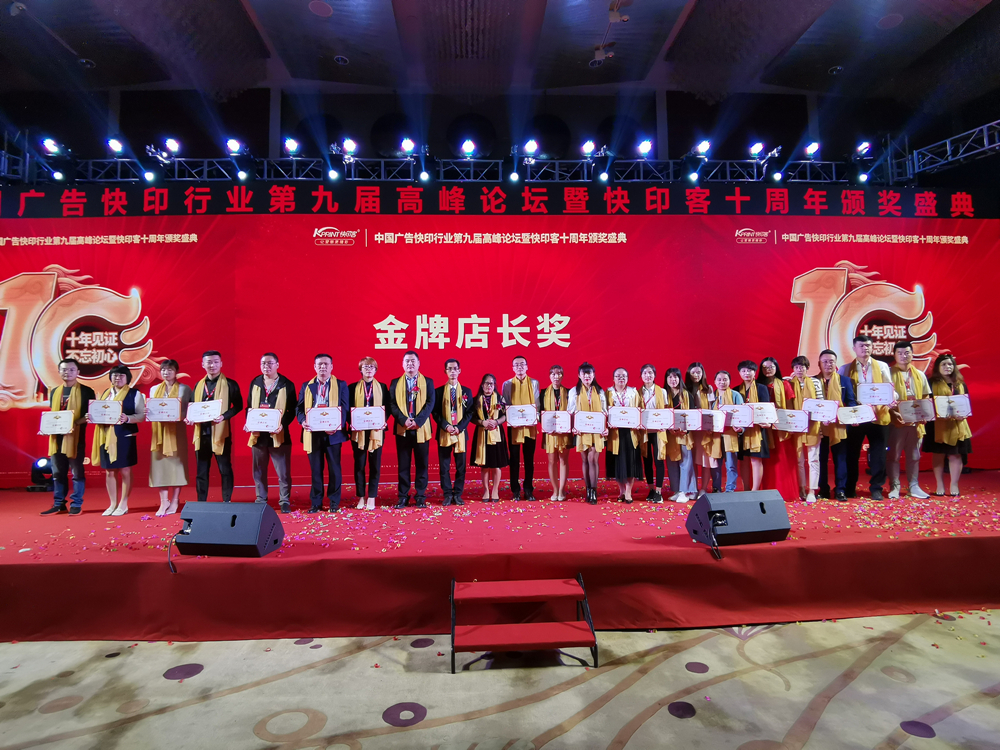 2019年,也是快印客成立的第十年,作為廣告快印行業(yè)新模式的創(chuàng)造者和領(lǐng)航者,本屆高峰會(huì)“十年見(jiàn)證,不忘初心”為主題,向行業(yè)展示了快印客十年取得的豐碩成果,共同開(kāi)啟下一個(gè)黃金十年,并向過(guò)去一年里為行業(yè)做出突出貢獻(xiàn)的公司和個(gè)人頒發(fā)了榮譽(yù)獎(jiǎng)項(xiàng)。