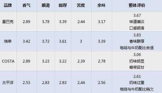 而20位咖啡達人對4款美式咖啡的整體風味評價也不盡相同:瑞幸有適度的酸度,具有水果及焦糖風味,接受程度最高;星巴克煙感重,咖啡本身甜感低;COSTA煙感及陳味明顯,酸酐較強,咖啡甜感低;太平洋入口微苦甜感低,酸苦較平衡。