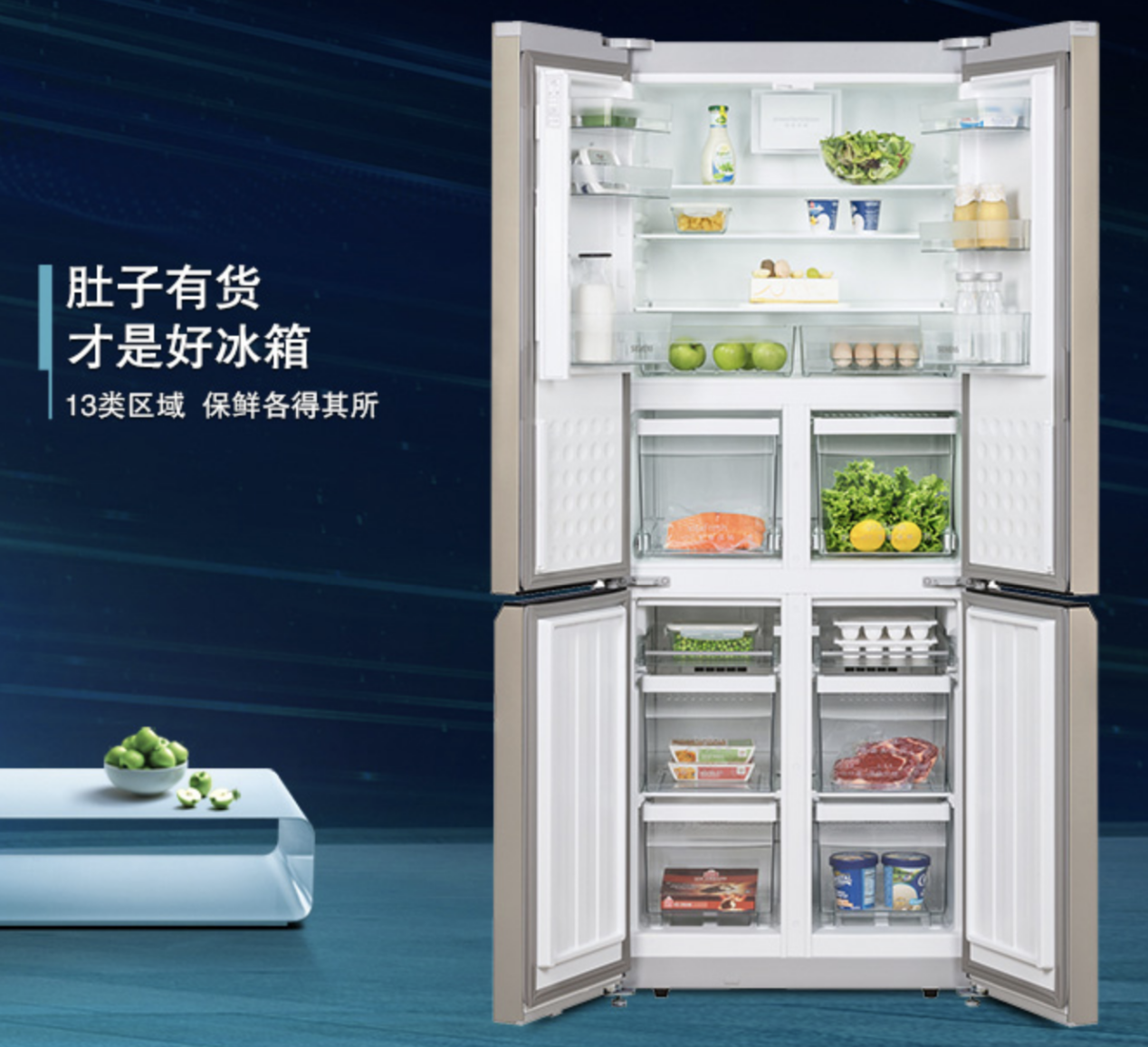 西門子KM46FA30TI采用十字對(duì)開(kāi)門設(shè)計(jì),不僅簡(jiǎn)約美觀,容積更是達(dá)到了452升,13類區(qū)域設(shè)置,讓每份食物都各得其所,滿足了家庭更多的儲(chǔ)存需求?;炖潆p動(dòng)力、風(fēng)冷無(wú)霜、零度保鮮,可以讓蔬菜水果保持新鮮水嫩,也可以讓魚、肉營(yíng)養(yǎng)不流失,鮮嫩如常。LCD顯示+觸摸控制,嵌入式門把手,閉門系統(tǒng),它不妥協(xié)任何細(xì)節(jié),盡顯人們生活品味。