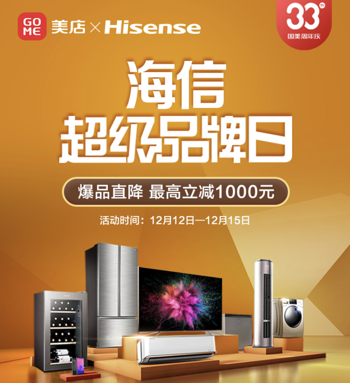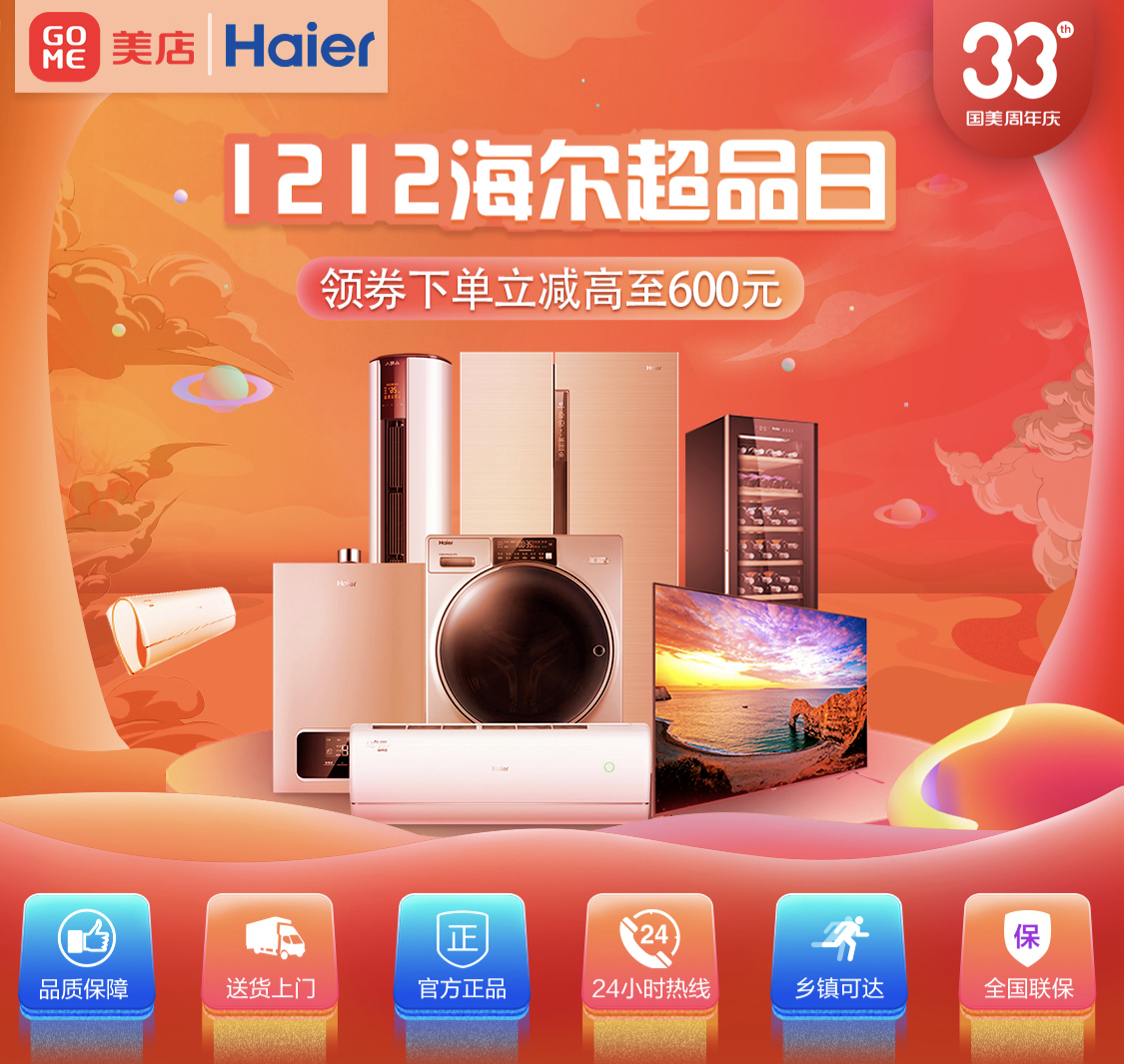 12月12日-15日,33周年生日之際,國美與海爾再度攜手,國美美店帶來海爾超級品牌日活動,涵蓋了海爾冰箱、洗衣機(jī)、空調(diào)、電視、廚房衛(wèi)浴等多個(gè)品類豐富產(chǎn)品,多重優(yōu)惠福利、六大承諾保障、延保清洗服務(wù)。