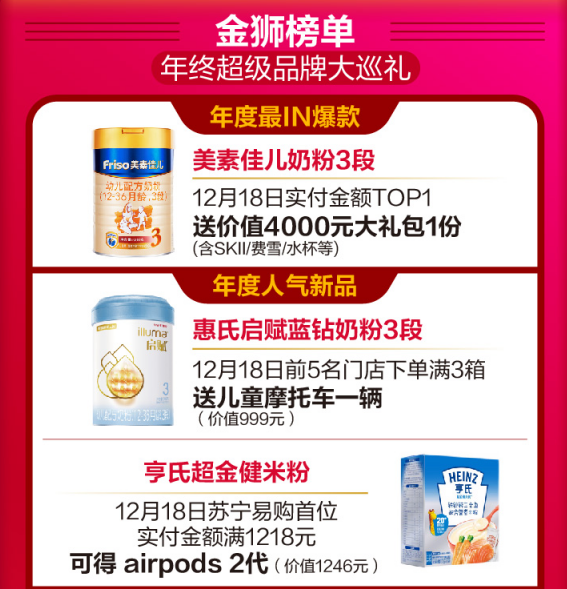 蘇寧紅孩子金獅榜單上,年度最I(lǐng)N爆款、人氣新品、超級品牌大巡禮,全是親子家庭想要的。寶媽寶爸購美素佳兒奶粉3段且實付金額TOP1的用戶將免費獲得價值4000元大禮包一份;單會員ID購買惠氏藍鉆系列奶粉實付金額最高且滿3999元,就送祖馬瓏圣誕限量香氛禮盒一套;購買飛鶴奶粉首位且實付金額滿8888元的消費者將獲得華為NOVA5G一個。此外,亨氏、樂可愛、費雪、小豬班納、好奇等母嬰品牌都有超值驚喜和好禮相送。