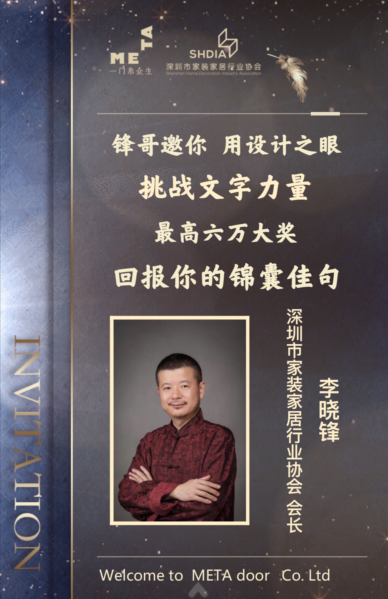 本次活動(dòng)是深圳市家裝家居行業(yè)協(xié)會(huì)繼打造業(yè)內(nèi)第一個(gè)門(mén)店設(shè)計(jì)邀請(qǐng)賽后,策劃的又一件引起行業(yè)轟動(dòng)的事情。深圳市家裝家居行業(yè)協(xié)會(huì)李曉鋒會(huì)長(zhǎng)邀請(qǐng)全國(guó)家居設(shè)計(jì)師一起玩“跨”界——為曼特門(mén)業(yè)設(shè)計(jì)廣告推廣語(yǔ)。本次邀請(qǐng)賽也是業(yè)內(nèi)首次面向設(shè)計(jì)師群體的推廣語(yǔ)征集活動(dòng),曼特門(mén)業(yè)將用六萬(wàn)大獎(jiǎng)回報(bào)設(shè)計(jì)師的錦囊佳句。
