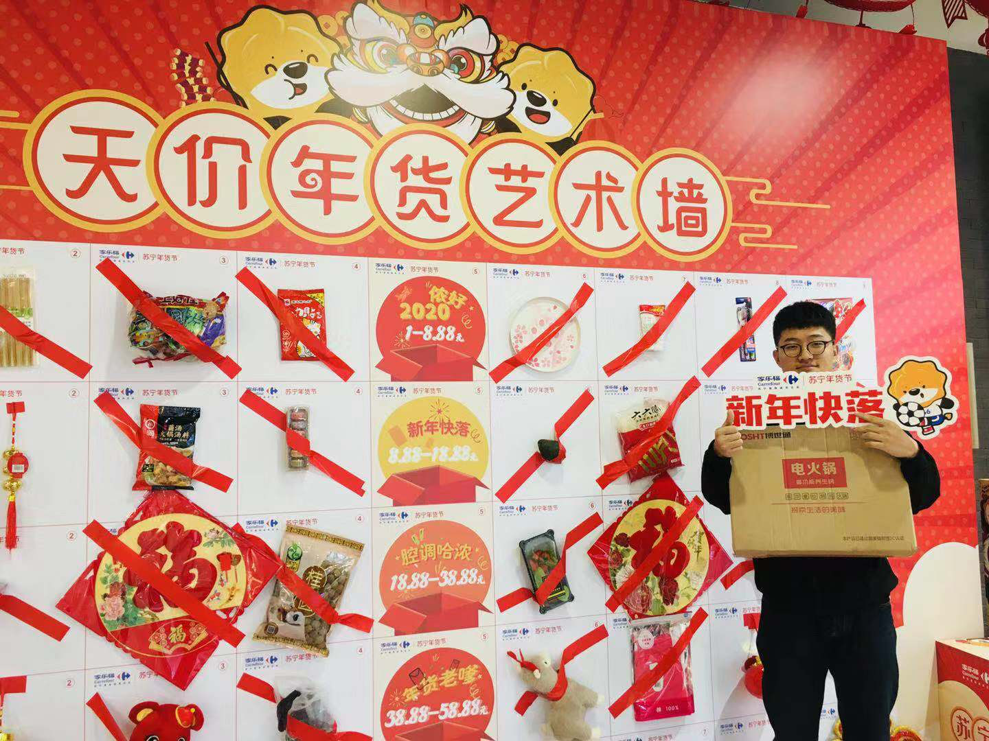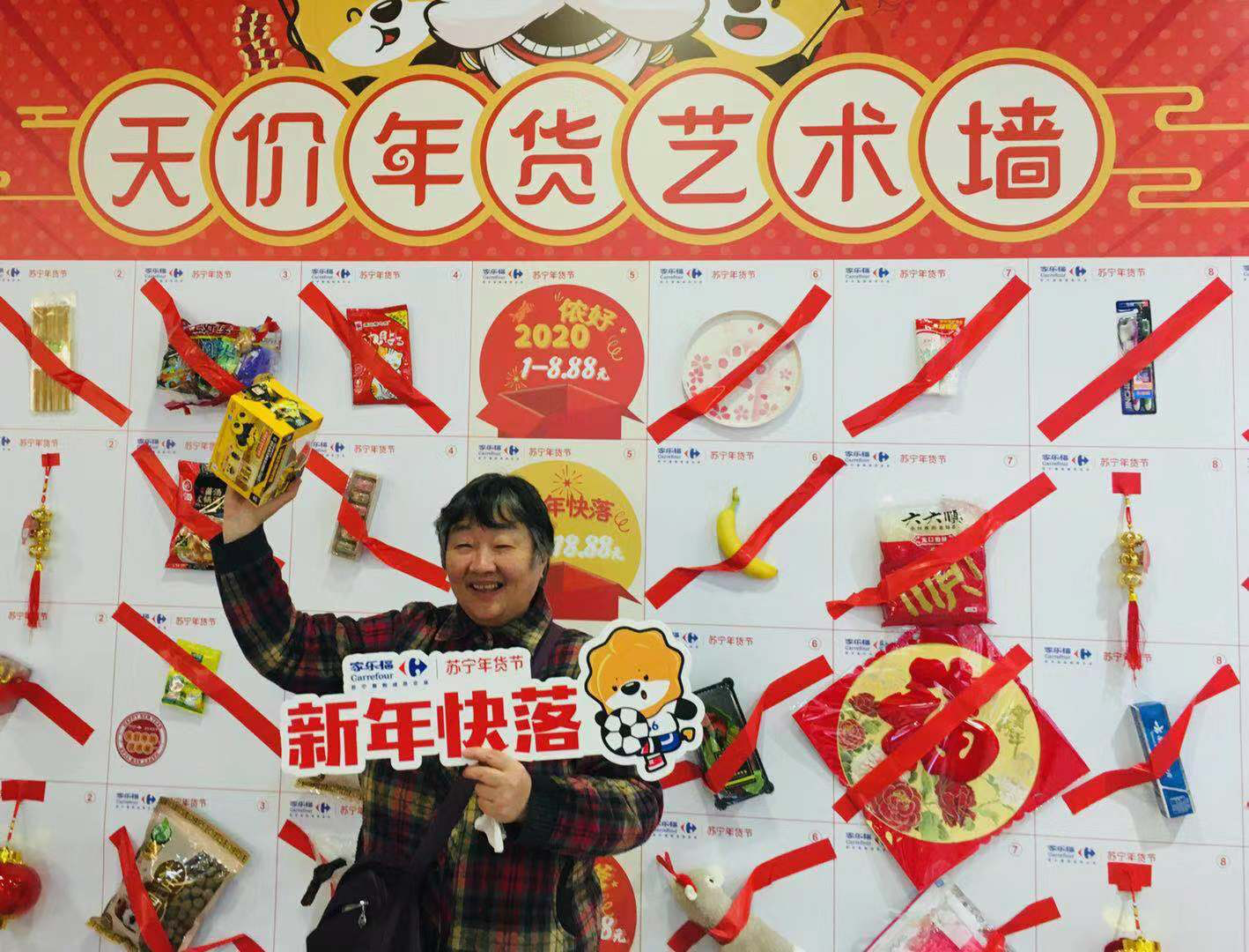 1月10日上午,記者來到家樂?!澳晡豆狻碧靸r年貨藝術(shù)墻的活動現(xiàn)場,眾多市民正想躍躍欲試。記者發(fā)現(xiàn),在天價年貨藝術(shù)墻上,有儂好2020、新年快落、腔調(diào)哈濃、年貨老嗲、“鼠”儂最美五類天價年貨。