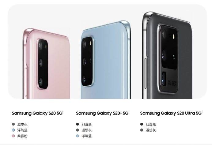 在配色的選擇上,其中Galaxy S20提供遐想灰、浮氧藍、柔霧粉三種配色,Galaxy S20+提供幻游黑、遐想灰、浮氧藍三種配色,Galaxy S20 Ultra提供幻游黑、遐想灰兩種配色。也能夠滿足不同消費者的實際需求。