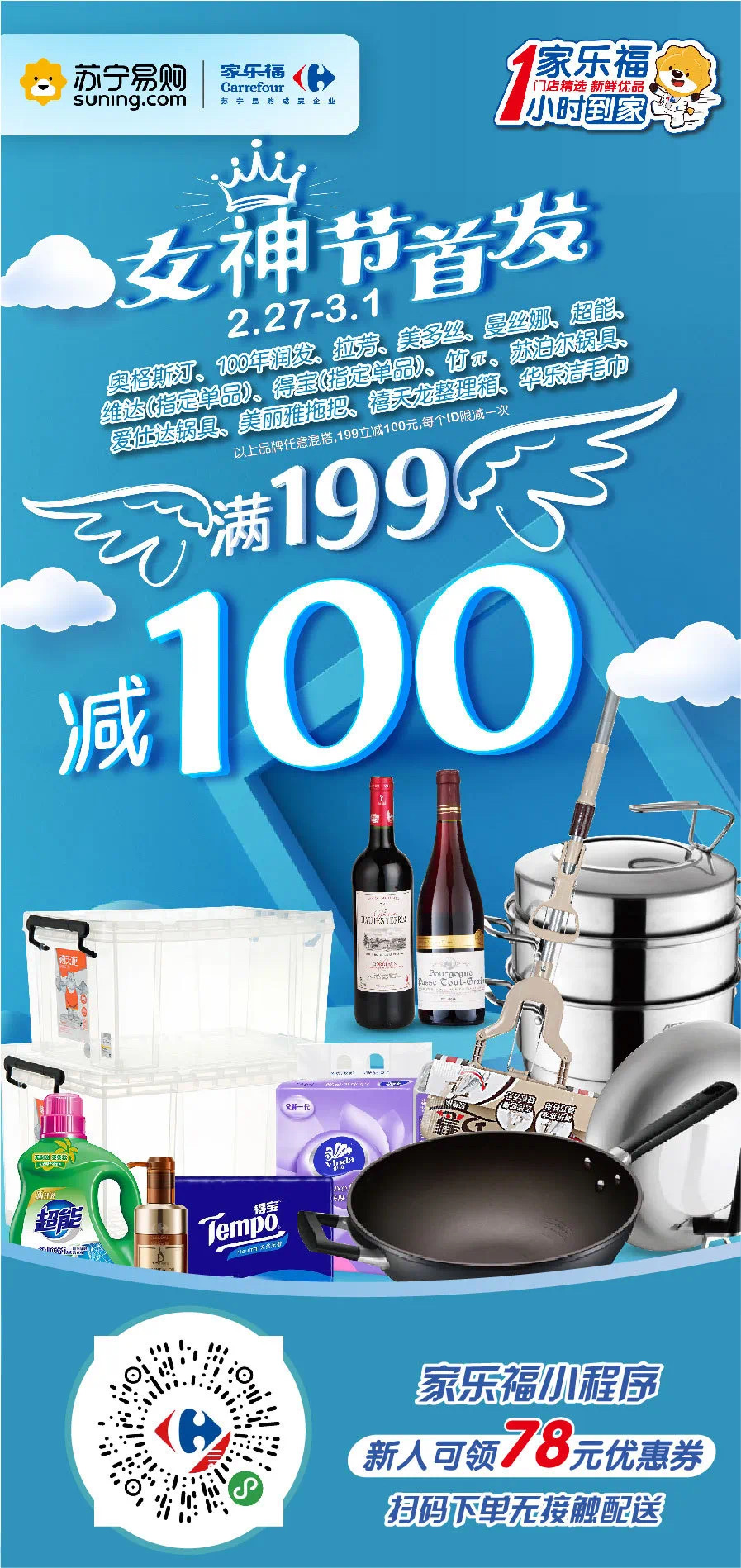 2月27日至3月1日,在家樂福小程序購買奧格斯汀、100年潤(rùn)發(fā)、拉芳、美多絲、曼絲娜、超能、維達(dá)(指定單品)、得寶(指定單品)、蘇泊爾鍋具、愛仕達(dá)鍋具、美麗雅拖把等非食品類指定品牌滿199立減100元。