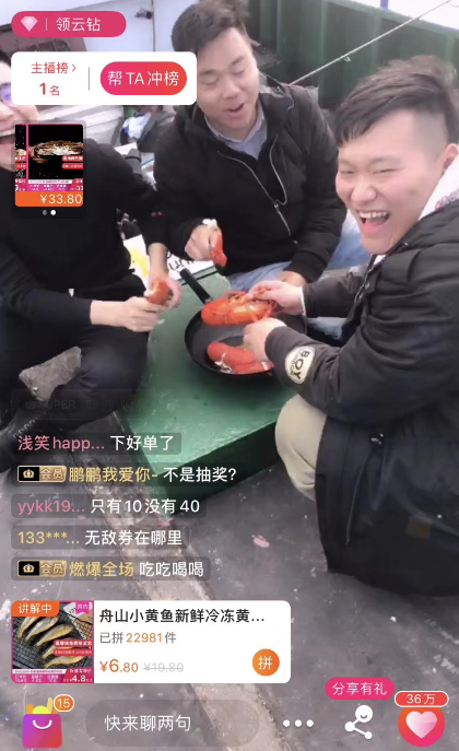 一旁直播的尹鴻狀態(tài)正好,從剛開播到現(xiàn)在,直播間的人數(shù)嗖嗖往上竄,不一會(huì)便聚集了十幾萬圍觀群眾。搖晃的直播鏡頭,更具真實(shí)感,似乎把觀眾帶到了船上一般。尹鴻馬不停蹄在船上踱步,給觀眾介紹各種海鮮小知識(shí),并大力吆喝起這次直播主打的兩款產(chǎn)品:深海小黃魚和舟山帶魚?!拔覀兲K寧拼購的海產(chǎn)品都是從張老大這樣漁民手中收來的,下單直發(fā),眼見為實(shí)?!?/p>