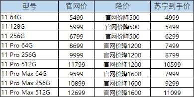 目前在蘇寧易購官網,iPhone11 Pro Max各型號全部降價1600元,最低7999元就能入手;iPhone11 Pro降價1200元,64G版本7499元;同時,iPhone11也降了500元,最低配64G版本售價4999元。此外,iPhone XR等上一代機型也有不同程度降價力度。