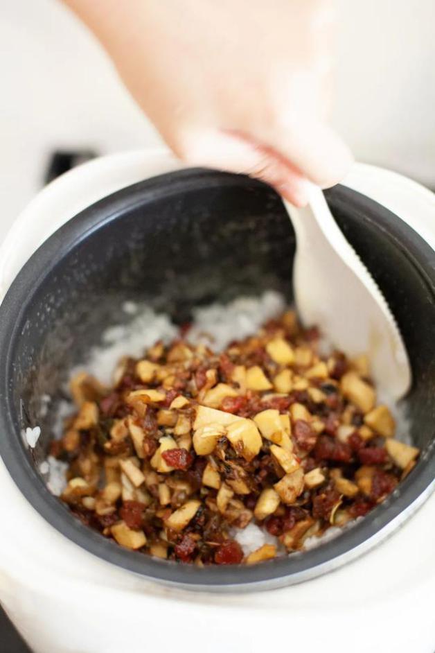 5.米飯煮熟后,把炒好的料倒入電飯煲中,翻拌均勻,再次蓋上蓋,用電飯煲保溫燜10分鐘。即可出鍋享用啦。