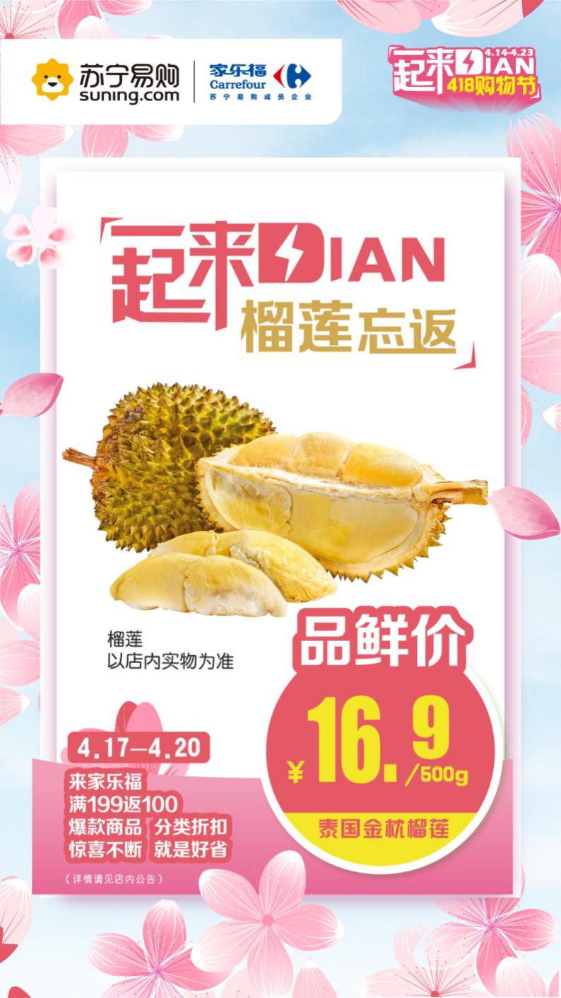 據(jù)有關方面透露,即將啟幕的“4.18一起來Dian”購物節(jié),家樂福將加碼福利,推出重磅優(yōu)惠的同時,奉上多款強勢優(yōu)質生鮮爆品,勢要擊穿底價。以“水果之王”榴蓮為例,每斤16.9元的限時品鮮價。