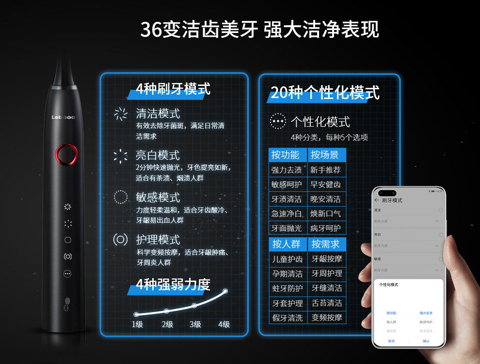 值得一提的是,力博得智能聲波牙刷·星鉆內(nèi)置壓力傳感系統(tǒng),具有36種潔齒檔位,4種潔齒模式和4級(jí)力度調(diào)節(jié)。強(qiáng)勁清潔模式:滿足日常清潔需求;拋光亮白模式:適合追求亮白人士;溫和敏感模式:適合牙齦易出血人群;輕柔護(hù)理模式:為牙病問(wèn)題而生,體貼入微。以上模式各有1-4級(jí)力度調(diào)節(jié),更加人性化。