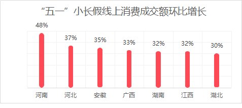 “五一”小長(zhǎng)假尤其對(duì)河南、河北、安徽等中部省份的線上消費(fèi)拉動(dòng)作用更強(qiáng)。由于一線城市的線上消費(fèi)趨于日?;藗兌嗤獬龌顒?dòng),用親近大自然、戶外活動(dòng)的方式度過假日。同時(shí),一部分在大城市里工作的人員也在假日返回老家,帶動(dòng)了中部省份的線上消費(fèi)。