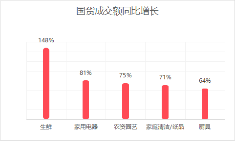“五一”小長(zhǎng)假期間,國(guó)產(chǎn)商品的成交額同比增長(zhǎng)了52%。國(guó)產(chǎn)的生鮮產(chǎn)品十分豐富,農(nóng)產(chǎn)品觸網(wǎng)利用信息經(jīng)濟(jì)快速的將地方市場(chǎng)轉(zhuǎn)化為全國(guó)市場(chǎng),成交額同比增長(zhǎng)了148%。此外,國(guó)產(chǎn)的家電、農(nóng)資園藝、清潔用品及廚具的成交額同比增長(zhǎng)較高。