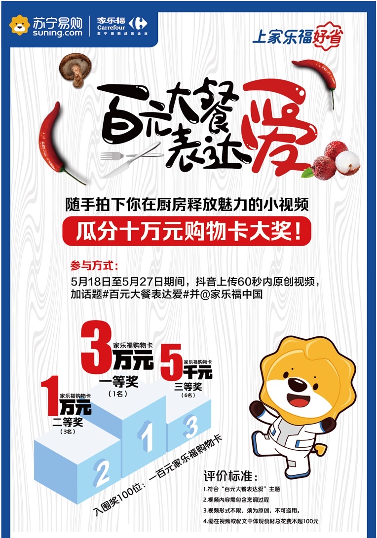 近期陳老伯和女兒聊的最多的除了做菜,還有父女倆都很期待的一場(chǎng)比賽。據(jù)悉,5月18日至6月18日,家樂福將舉辦一場(chǎng)主題為“百元大餐表達(dá)愛”的鄰家大廚視頻PK賽,鼓勵(lì)參賽者做道有故事的菜,向摯愛的人表達(dá)濃濃的情意。你負(fù)責(zé)做菜,家樂福負(fù)責(zé)買單。你無需具備可媲美專業(yè)廚師的高超技藝,僅需擁有一顆熱愛美食的心和一雙巧手,無論是國(guó)人經(jīng)典標(biāo)配的“四菜一湯”,抑或是最適合情侶的西式浪漫—牛扒配紅酒,隨你發(fā)揮。以百元預(yù)算準(zhǔn)備食材,將烹調(diào)過程上傳抖音。屆時(shí),突圍選手將有機(jī)會(huì)瓜分價(jià)值十萬元的購(gòu)物卡大獎(jiǎng)。