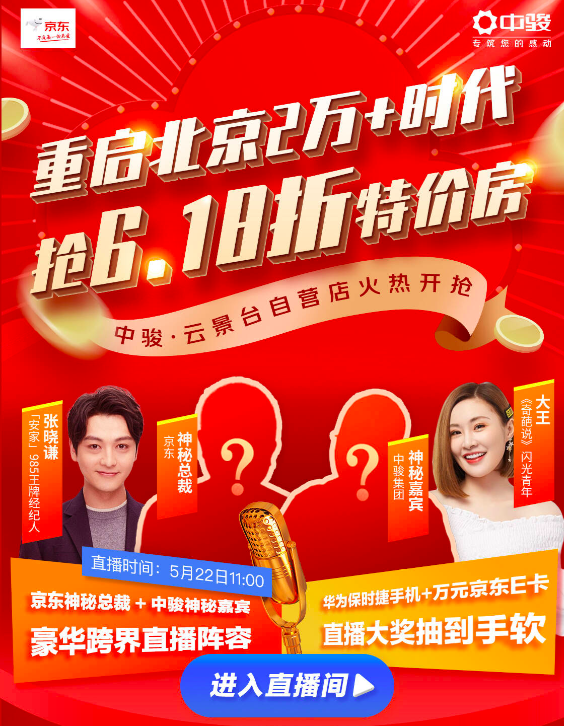 值得關(guān)注的是,中國內(nèi)地男演員張曉謙、奇葩說選手大王、以及京東和中駿的兩位“神秘嘉賓”還將在5月22日上午11點帶來直播,在線預(yù)售全新房源,并將一套6.18折的特價房開展618抽獎活動,優(yōu)惠后僅需一百多萬元即可拿下一套北京新房。