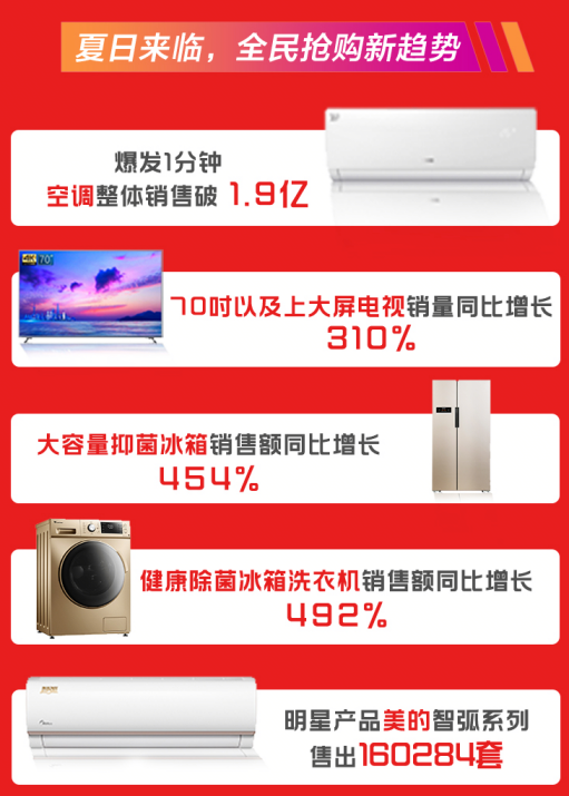 在品類表現(xiàn)上,空調(diào)、冰洗、彩電銷售火熱。爆發(fā)1分鐘,空調(diào)整體銷售破1.9億,明星產(chǎn)品美的智弧系列18小時(shí)售出160284套;截至18時(shí),健康除菌冰箱洗衣機(jī)銷售額同比增長492%。