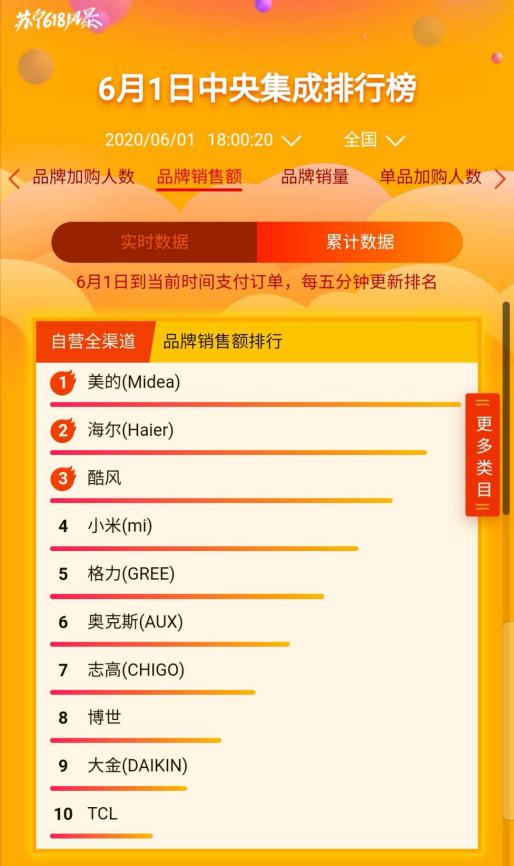 在蘇寧悟空榜,家電板塊火拼激烈,頭部品牌在蘇寧全渠道銷售暴增。截至6月1日18時(shí),美的摘得家用空調(diào)及中央集成全渠道銷售額冠王,同時(shí)橫跨多品類品牌TOP榜,成為最大贏家。