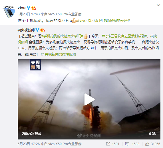 見(jiàn)圳客戶(hù)端 ·深圳新聞網(wǎng)2020年6月28日訊 北斗系統(tǒng)第五十五顆導(dǎo)航衛(wèi)星暨北斗三號(hào)最后一顆全球組網(wǎng)衛(wèi)星,6月23日9時(shí)43分成功發(fā)射。為了多角度拍攝火箭點(diǎn)火,央視新聞在導(dǎo)流槽附近架設(shè)多臺(tái)vivo X50 Pro手機(jī),一臺(tái)位于導(dǎo)流槽旁邊,距離火箭10米的位置,用于拍攝點(diǎn)火近景;兩臺(tái)架設(shè)在導(dǎo)流槽后方30米的距離,用于拍攝點(diǎn)火中景,以及點(diǎn)火后的蒸汽場(chǎng)景。
