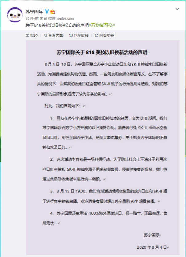 “我們的活動,原本是為了防止社會上不法分子,利用這些口紅空管和神仙水瓶子用來制假售假,侵害消費者的權(quán)益,沒想到會被部分網(wǎng)友曲解。希望消費者都能理性思考,獨立判斷,勿信謠傳謠?!碧K寧國際相關(guān)負(fù)責(zé)人表示。