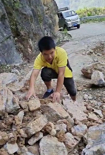 由于前期暴雨天氣,焦厚松車才開到半路,就看到前方的路有了滑坡,緊靠著崖壁的道路已經(jīng)垮了一半?!暗纛^還是前行?”焦厚松最終戰(zhàn)勝了猶豫,“答應(yīng)了用戶今天送到,不能就這樣放棄,先看看情況?!彼_始下車觀察路況,發(fā)現(xiàn)主要是碎石堵住了前方七八米的路程?!叭绻謇硪恍?,車輛就能開過去。”說干就干,焦師傅隨后就開始徒手清理路上的石塊。