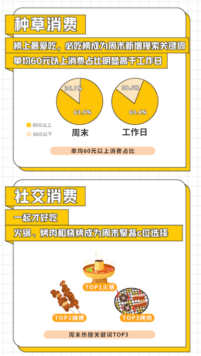 跟著榜單種草、拔草的“種草消費”成為周末消費的重要特點之一。美團6-7月數(shù)據(jù)顯示,“必吃榜”成為周末新增熱搜關(guān)鍵詞,且6-7月周末單均60元以上消費占比達63.9%,明顯高于工作日的60.4%。
