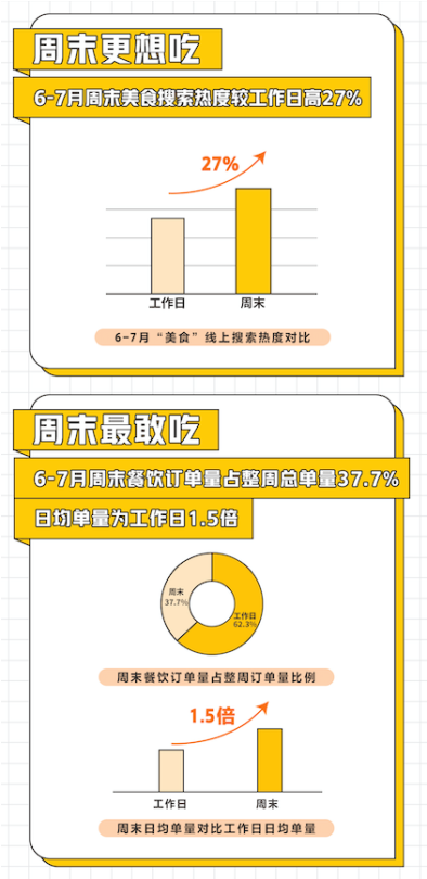 據(jù)美團點評餐飲學(xué)院發(fā)布的《2020周末餐飲堂食消費趨勢洞察》顯示,疫情恢復(fù)期,餐飲堂食消費活力回歸,周末餐飲消費對整個餐飲市場復(fù)蘇助力明顯。美團6-7月線上美食搜索熱度中,周末的搜索熱度較工作日高出27%;周末餐飲線上訂單量占整周總單量的37.7%,日均單量為工作日的1.5倍。周末餐飲消費拉動經(jīng)濟復(fù)蘇,正在成為驅(qū)動消費的新引擎。