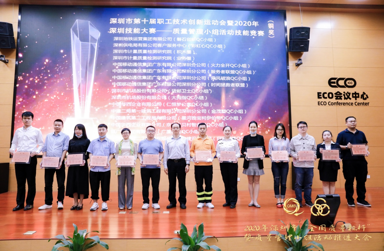 現(xiàn)場(chǎng),獲得深圳市第十屆職工技術(shù)創(chuàng)新運(yùn)動(dòng)會(huì)暨2020年深圳技能大賽——質(zhì)量管理小組活動(dòng)技能競(jìng)賽金獎(jiǎng)的小組深圳市中興通訊股份有限公司低空飛行QC小組、中國(guó)華西企業(yè)有限公司冠澤金融中心QC小組為大家作了精彩發(fā)表展示。由市總工會(huì)基層組織建設(shè)和經(jīng)濟(jì)工作部二級(jí)調(diào)研員張麗英宣讀“深圳市第十屆職工技術(shù)創(chuàng)新運(yùn)動(dòng)會(huì)暨2020年深圳技能大賽——質(zhì)量管理小組活動(dòng)技能競(jìng)賽”結(jié)果的通報(bào),并為16個(gè)金獎(jiǎng)小組進(jìn)行授牌,市政協(xié)常委、市質(zhì)量協(xié)會(huì)執(zhí)行會(huì)長(zhǎng)李榕,市科協(xié)機(jī)關(guān)黨委副書記、紀(jì)委書記劉衛(wèi)東,市婦聯(lián)組聯(lián)發(fā)展部二級(jí)調(diào)研員嚴(yán)俊勇,工商聯(lián)會(huì)員部部長(zhǎng)劉傳分別為32個(gè)銀獎(jiǎng)和32個(gè)銅獎(jiǎng)小組進(jìn)行授牌。