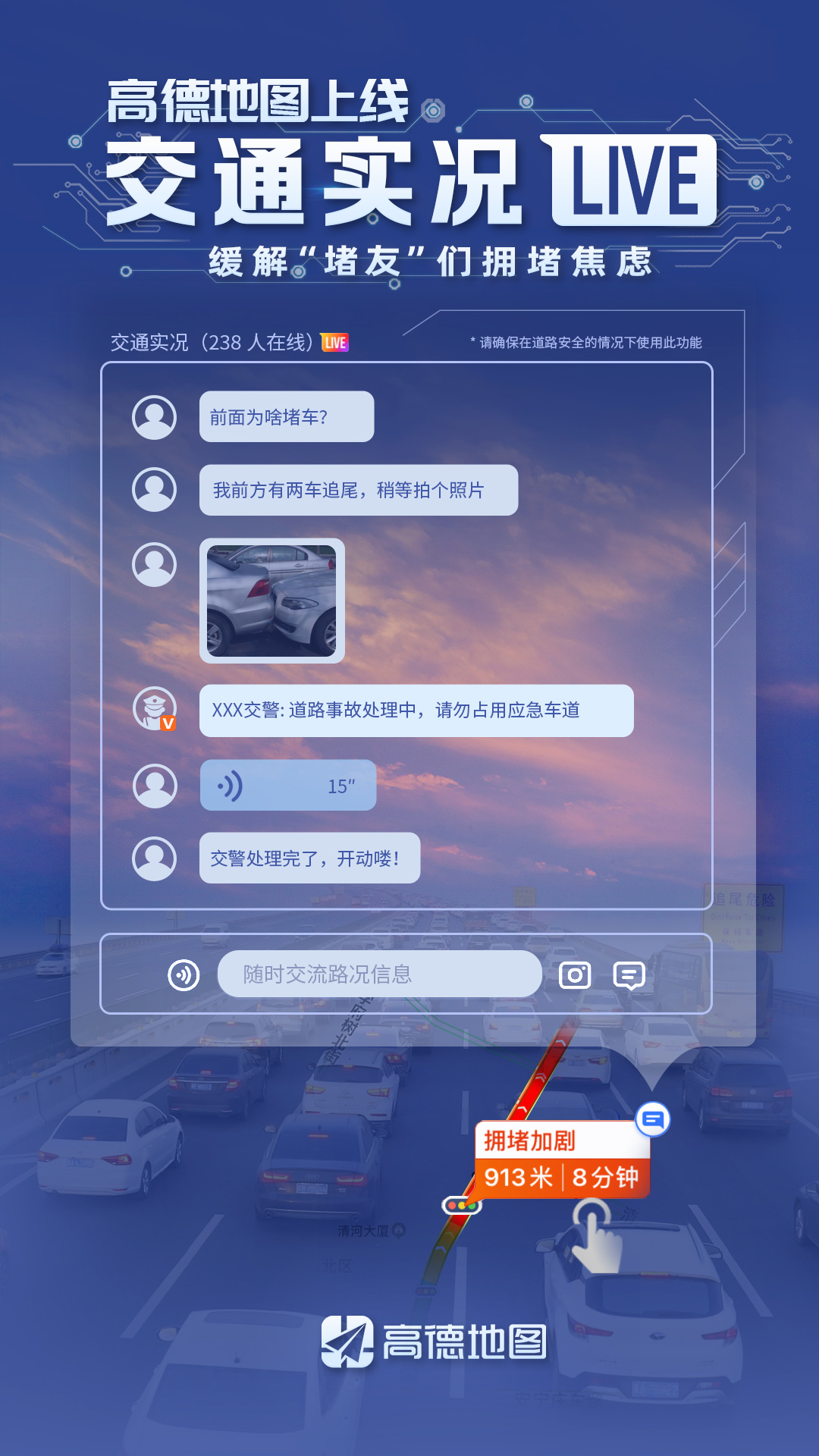 通過這個平臺,各地交管部門可及時發(fā)布擁堵事件的權威信息,如擁堵原因、派警情況、預計疏通用時及現(xiàn)場圖片等。當用戶進入嚴重擁堵路段時,通過點擊提醒氣泡即可進入該界面,實時了解擁堵信息。在車輛因堵車無法行進時,“堵友”們還可以互通有無,通過文字、語音、圖片等多種方式,為后方司機分享第一手信息。而當擁堵疏散時,“交通實況”功能也將自動關閉。