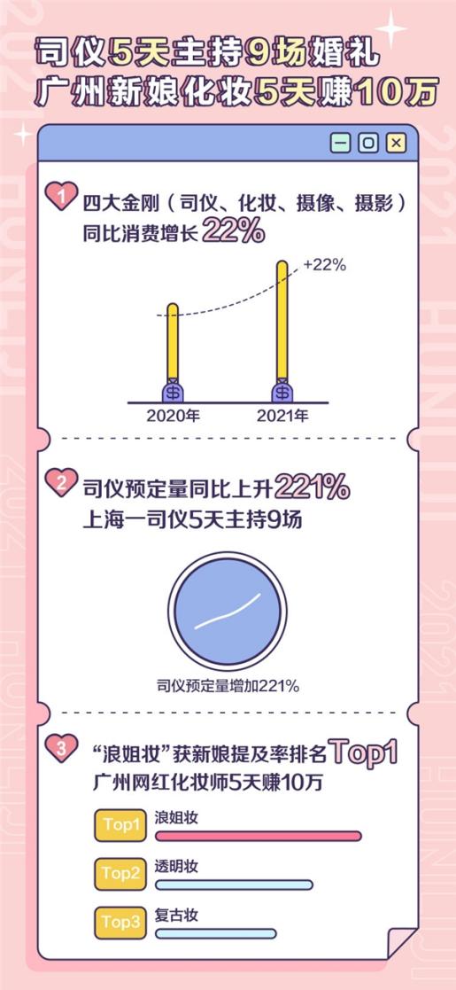數(shù)據(jù)顯示,五一迎來(lái)2021年首個(gè)結(jié)婚高峰,5天內(nèi)超40萬(wàn)對(duì)新人舉辦婚禮,同比去年翻兩番。五一婚禮消費(fèi)總額破1億,在一定程度上拉動(dòng)暖春經(jīng)濟(jì)。婚禮消費(fèi)前十城市分別是北京、上海、廣州、武漢、成都、深圳、溫州、無(wú)錫、杭州、蘇州。