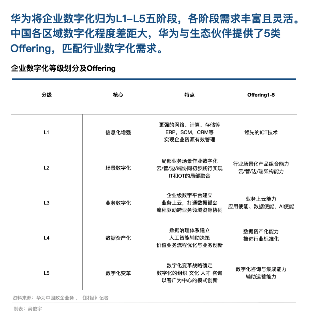 應(yīng)對(duì)每個(gè)階段的數(shù)字化挑戰(zhàn),需要提供可靈活搭配的能力,其中可能涉及ICT技術(shù)這類L1級(jí)能力,也可能涉及數(shù)字化咨詢、集成、輔助運(yùn)營(yíng)這類L5級(jí)能力。為此,華為攜手伙伴提供了5類Offering。