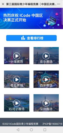 ICode2021中國區(qū)決賽每個分賽場都安排賽況實(shí)時直播,個人全國排行榜/分賽場排行榜實(shí)時可見。家長及帶隊(duì)老師們可以時刻掌握孩子的闖關(guān)進(jìn)度。選手比賽名次透明且公開,家長和帶隊(duì)老師雖身不在考場,但心依舊可以感受到選手的努力和創(chuàng)意,ICode架起選手與家長和老師之間的橋梁,為每一步小小 的 前進(jìn)而喝彩。
