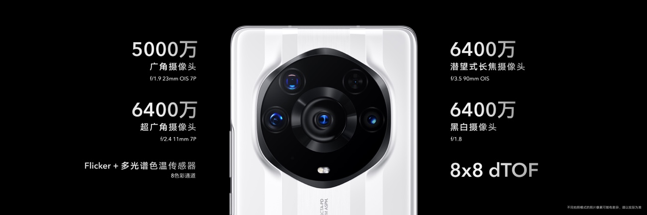 影像方面,榮耀Magic3至臻版打破手機(jī)鏡頭天花板,突破性地采用了多主攝設(shè)計(jì)。在與榮耀 Magic3 Pro采用同樣的業(yè)界領(lǐng)先6400萬潛望式長焦鏡頭和6400萬黑白鏡頭基礎(chǔ)上,榮耀 Magic3至臻版將5000萬像素超大底主攝升級為索尼 IMX700,傳感器尺寸達(dá)到1/1.28英寸,擁有業(yè)界領(lǐng)先的感光度(ISO),成像解析力、暗光拍攝能力更強(qiáng)。而超廣角微距鏡頭,也從1300萬像素,升級為業(yè)界領(lǐng)先的6400萬像素126°超大廣角微距鏡頭,能完美呈現(xiàn)廣闊空間中整個(gè)建筑、地標(biāo),亦能捕捉2.5cm近距離下的微小細(xì)節(jié),提供肉眼無法看到的創(chuàng)意視角。多主攝計(jì)算攝影,實(shí)現(xiàn)多焦段高清影像。