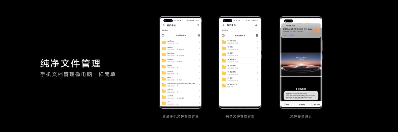 為了幫助事務(wù)繁多的商務(wù)人士更高效管理個(gè)人事務(wù),榮耀還與各辦公平臺合作,讓用戶在釘釘、飛書、Welink、WPS辦公平臺的日程均能通過榮耀Magic3系列進(jìn)行統(tǒng)一管理。而新增的純凈文件管理系統(tǒng)(此功能后續(xù)通過 OTA升級支持),則使榮耀Magic3系列在文件保存和管理方面進(jìn)行進(jìn)一步簡化,讓手機(jī)文件管理從此可以像電腦一樣簡單便捷。