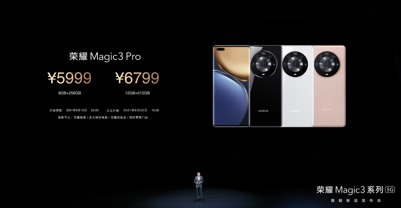 榮耀 M agic38GB+128GB版售價(jià)4599元,8GB+256GB版售價(jià)4999元;榮耀Magic3 Pro8GB+256GB版售價(jià)5999元,12GB+512GB版售價(jià)6799元;榮耀Magic3至臻版12GB+512GB售價(jià)7999元。8月12日22:00榮耀 Magic3系列手機(jī)正式開啟預(yù)售,8月20日10點(diǎn)08分,榮耀 M agic3系列手機(jī)將于榮耀商城、各大授權(quán)電商、榮耀體驗(yàn)店、榮耀零售門店等全平臺開售。
