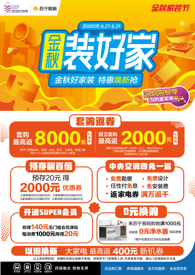 為了解決業(yè)主們的家裝問(wèn)題,蘇寧易購(gòu)于8月27日至8月29日啟動(dòng)廚衛(wèi)·金秋家裝節(jié),為近期需要對(duì)廚房進(jìn)行改造的業(yè)主,或是剛收新房的新業(yè)主,提供專業(yè)的廚衛(wèi)設(shè)計(jì)以及合適的廚衛(wèi)產(chǎn)品推薦;并且在活動(dòng)期間,來(lái)蘇寧易購(gòu)門(mén)店,購(gòu)買(mǎi)兩件以上廚衛(wèi)產(chǎn)品,且單價(jià)在2500元以上,即可參與廚衛(wèi)套購(gòu)活動(dòng),最高返2000元禮金券,還有以舊換新補(bǔ)貼以及0元換購(gòu)活動(dòng),來(lái)門(mén)店購(gòu)買(mǎi)如 A.O.史密斯等廚衛(wèi)產(chǎn)品,滿1000元即可0元換購(gòu)凈水器,消費(fèi)者僅需支付298元的安裝費(fèi)。并且凡在8月27日至9月12日間在蘇寧易購(gòu)門(mén)店購(gòu)買(mǎi)方太、老板、美的、 COLMO、西門(mén)子品牌的洗碗機(jī),消費(fèi)者將免費(fèi)獲得櫥柜局部升級(jí)改造活動(dòng)。