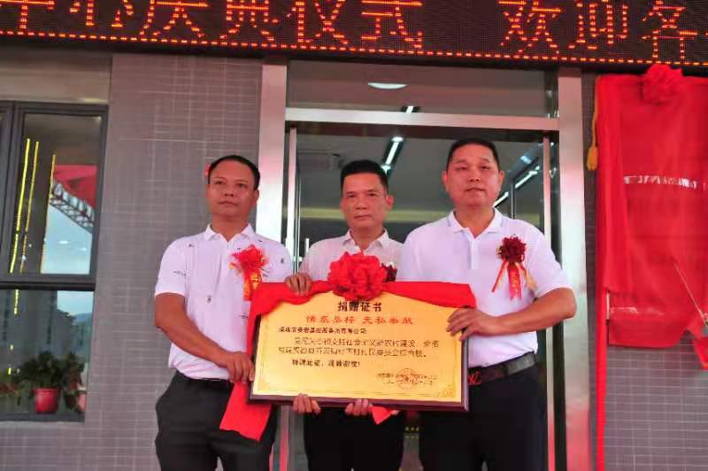 在落成典禮中,深圳安宏基控股集團(tuán)有限公司彭康輝董事將大樓辦公鑰匙移交給硁下村黨支部書記彭志康。村支書彭志康、五云鎮(zhèn)慈善會會長彭志響一起贈牌匾給深圳安宏基控股集團(tuán)有限公司彭康輝董事。