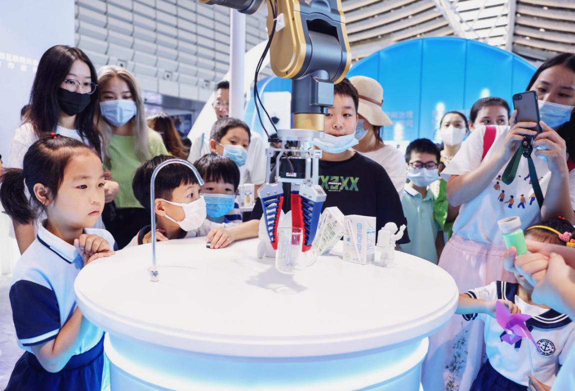這牛奶和其他的不太一樣,很香濃。“離心精萃‘白科技’開啟臻濃新紀(jì)元”展臺(tái)一直就是博覽會(huì)現(xiàn)場的“人氣王”,這里以宇宙探索為主題,科幻感十足,火箭發(fā)動(dòng)機(jī)噴出淡淡煙霧,三臺(tái)智能機(jī)械臂不停忙碌,人們排起長隊(duì),品嘗由“離心精萃科技”現(xiàn)場調(diào)制的伊利臻濃牛奶。在這里,吸引觀眾的不僅是美味的伊利牛奶,也有滿滿的數(shù)字科技。