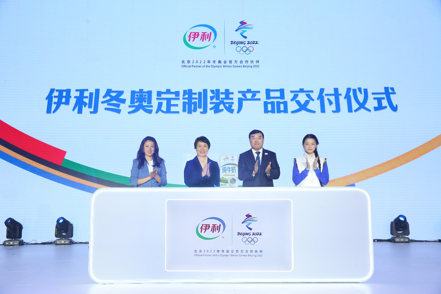 從左到右依次是:北京冬奧組委運(yùn)動(dòng)員委員會(huì)主席楊揚(yáng),北京冬奧組委專職副主席、秘書長(zhǎng)韓子榮,伊利集團(tuán)董事長(zhǎng)、總裁潘剛,伊利冬奧志愿團(tuán)形象大使