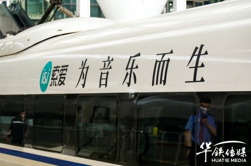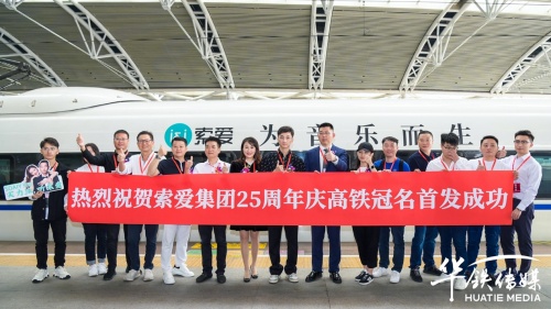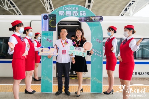 10月28日上午,索愛集團董事長劉建佳、總經(jīng)理全雪梅、華鐵傳媒集團廣州分公司銷售總經(jīng)理劉延群等領導嘉賓共同為冠名發(fā)車儀式揭幕、剪彩、互贈紀念禮品,在現(xiàn)場嘉賓的共同見證下,張貼索愛全新品牌代言人陳小春夫婦形象宣傳海報的“索愛-為音樂而生”高鐵冠名列車正式啟程。