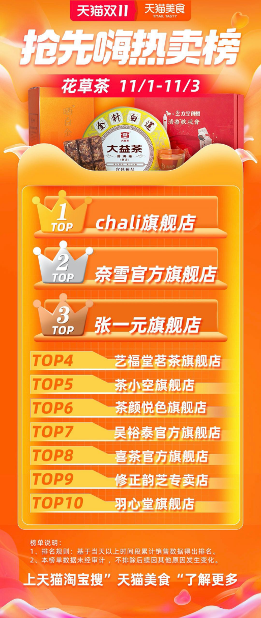 今年“雙11”電商購(gòu)物節(jié)比往年更早開(kāi)啟,10月20日晚8點(diǎn)便拉開(kāi)序幕,奈雪的茶隨之推出滿減、秒殺等多項(xiàng)優(yōu)惠活動(dòng)。奈雪此次雙11迎來(lái)開(kāi)門(mén)紅,數(shù)據(jù)顯示,11月1日凌晨開(kāi)售后僅10分鐘,奈雪的茶的銷售總額便突破去年全天。11月1日-3日,伴隨著茶禮盒等產(chǎn)品的熱銷,奈雪躋身花草茶銷售額排行榜TOP2。