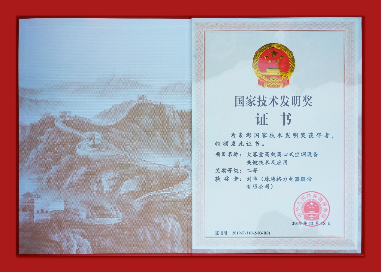 2019年度國(guó)家科學(xué)技術(shù)獎(jiǎng)在人民大會(huì)堂頒布,格力大容量高效離心式空調(diào)設(shè)備關(guān)鍵技術(shù)獲得國(guó)家技術(shù)發(fā)明獎(jiǎng)二等獎(jiǎng)。