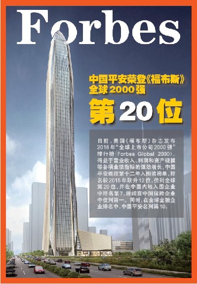 中國(guó)平安保險(xiǎn)(集團(tuán))股份有限公司連續(xù)第十二年入圍全球上市公司2000強(qiáng),排名較2015年躍升12位,位列全球第20位。
