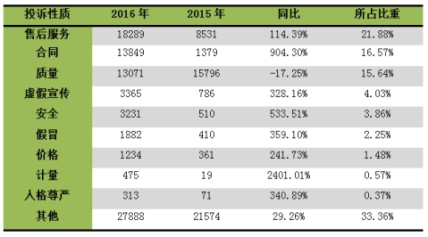 由于投訴總量的激增,相對于2015年,除質量問題之外,其他各類的投訴問題都增加,增加的幅度大多超過了1倍。如表3,圖4所示。